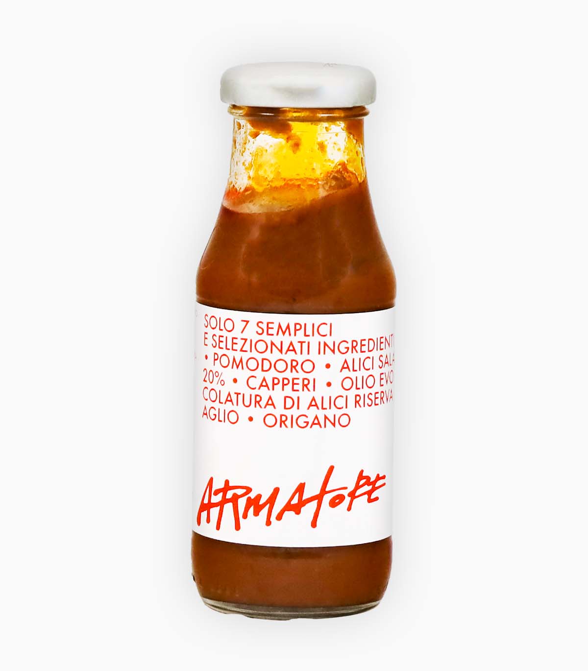 Il Sugo Marinara alle Alici di Armatore è un condimento artigianale ricco e vellutato, preparato con pomodoro italiano, aglio, olio d’oliva e alici di alta qualità.