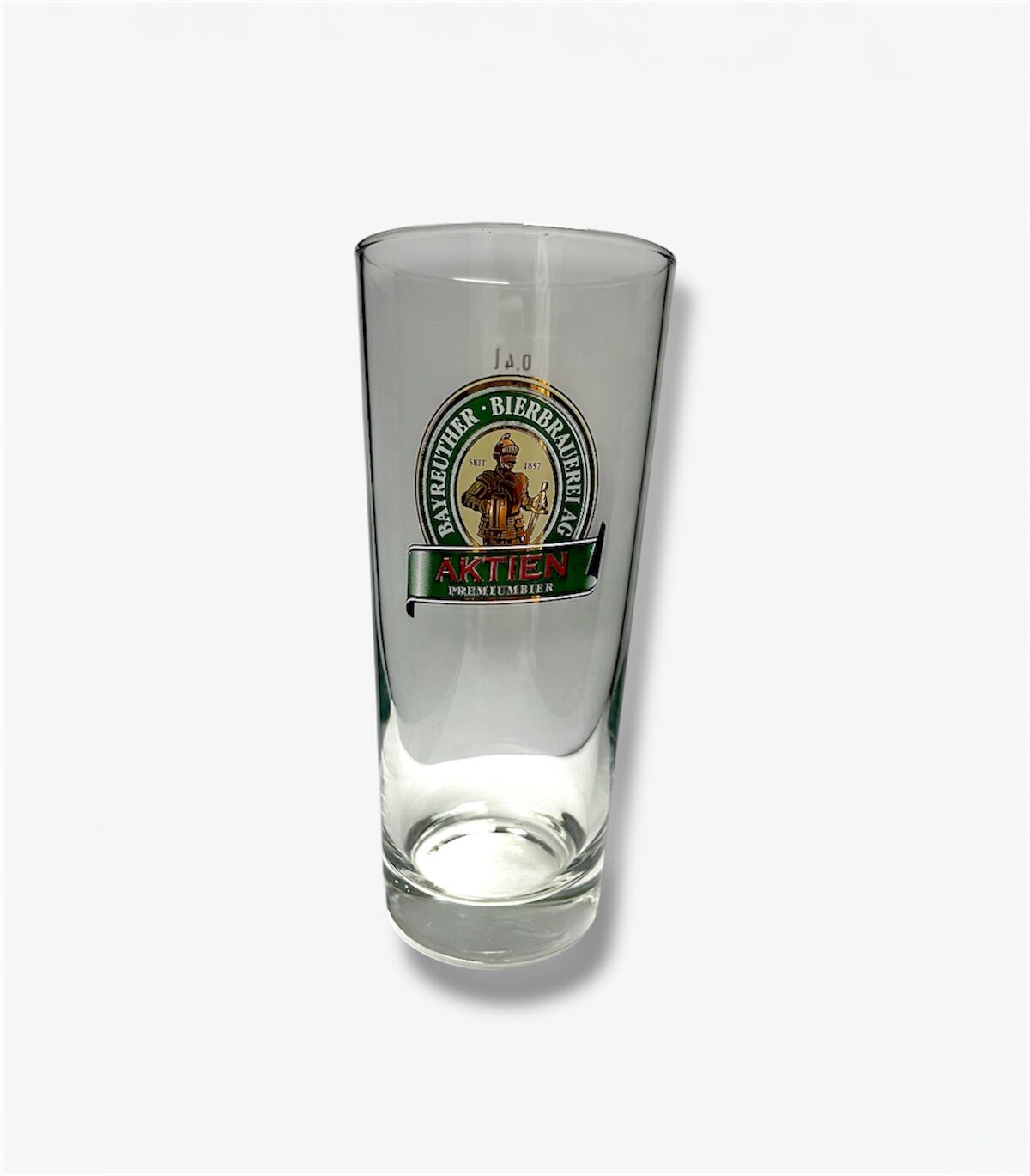 Bicchiere a forma di cono marchio Bayreuther Bierbrauerei in vetro trasparente ad alta brillantezza.