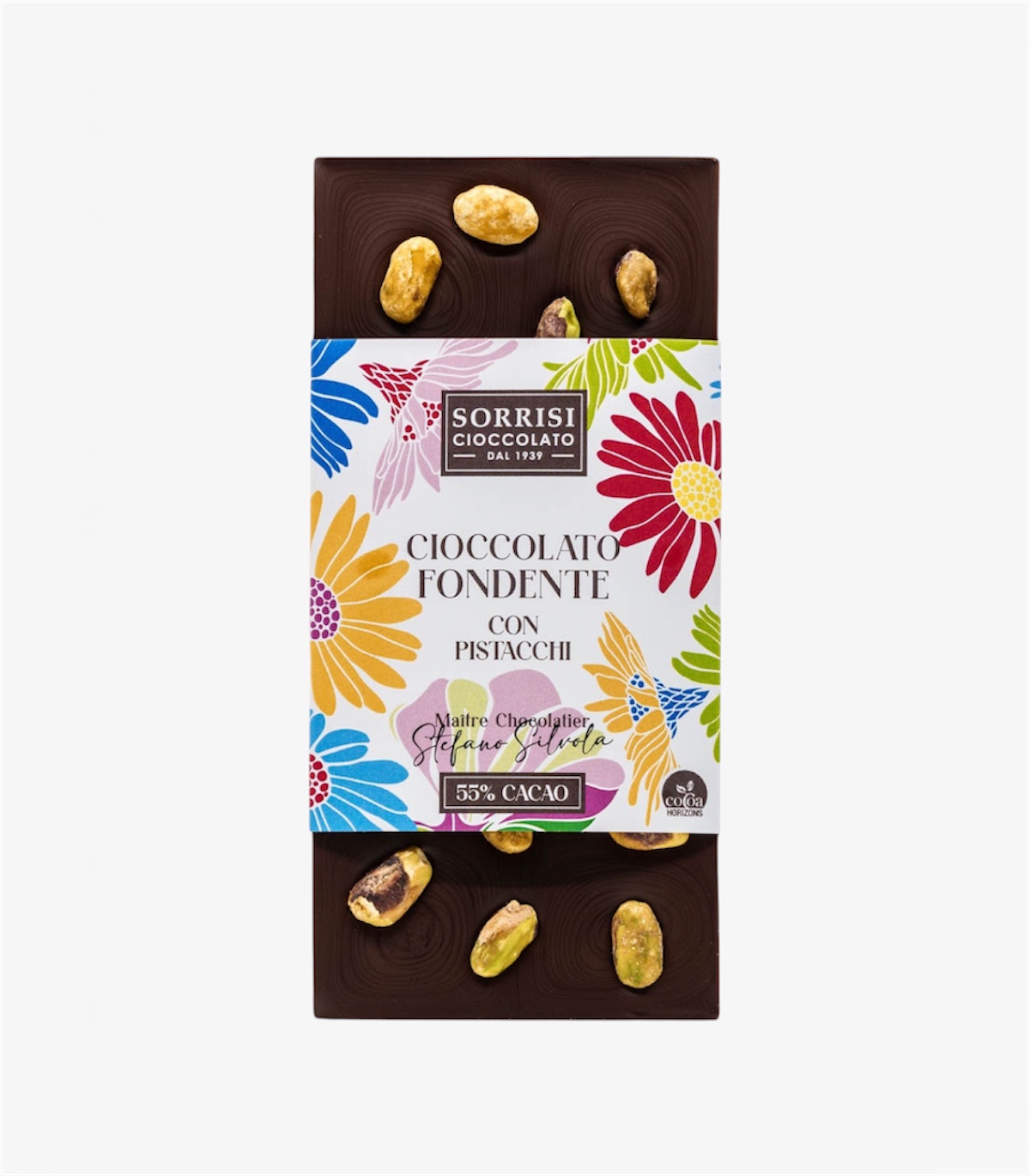 Questa tavoletta di cioccolato fondente 55% nasce da un pregiato blend che regala un pieno e intenso gusto di cacao, caratterizzato da un sapore equilibrato tra note fruttate e amare. Viene decorato a mano con granella di pistacchi.