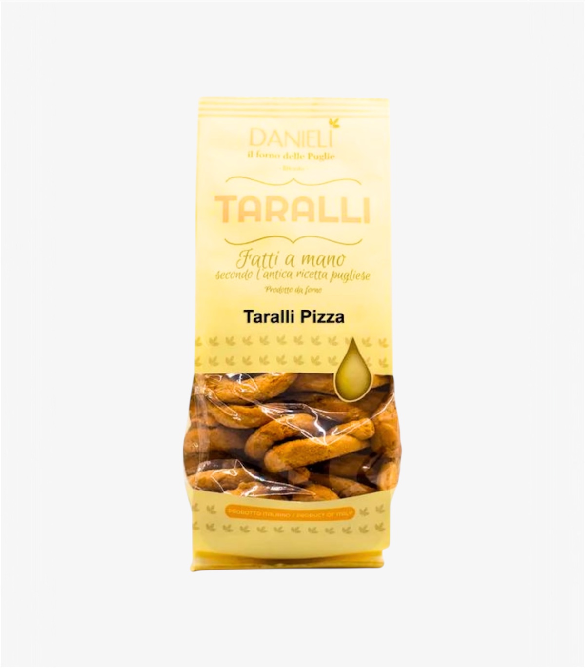 Originari della Puglia, i Taralli Danieli gusto Pizza reinterpretano il sapore simbolo dell’Italia in formato snack. Preparati con farina di grano tenero, pomodoro disidratato, origano, basilico, olio extravergine d’oliva pugliese, vino bianco e sale, sono cotti lentamente per ottenere la croccantezza tipica dei taralli artigianali.