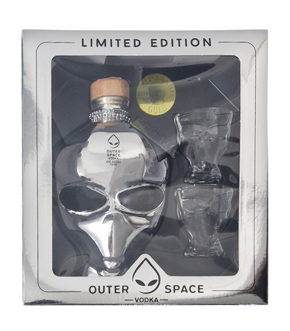 Questa vodka viene contenuta in una bottiglia cromata a forma di testa di alieno e venduta in un kit con due bicchieri da shot in omaggio.